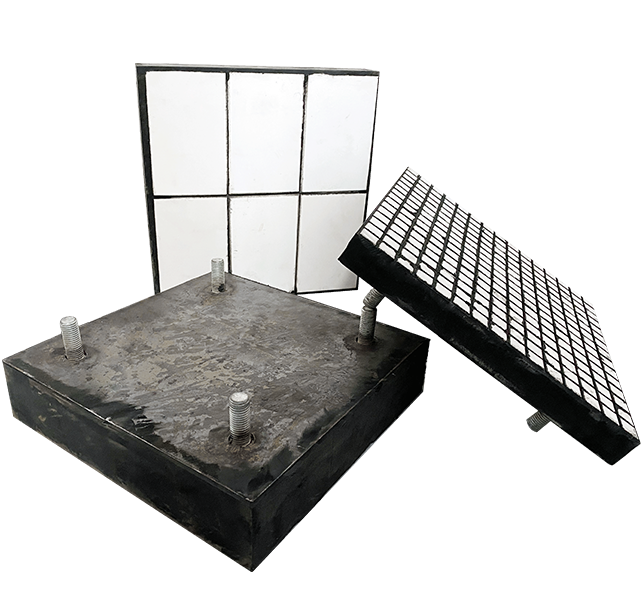即陶瓷和橡膠二合一板,將特殊的陶瓷片通過(guò)硫化工藝嵌入特種橡膠內(nèi),形成方形的耐磨橡膠陶瓷復(fù)合體,然后通過(guò)焊接或粘貼固定在設(shè)備的內(nèi)殼鋼板上,以形成堅(jiān)固而緩沖的耐磨層。